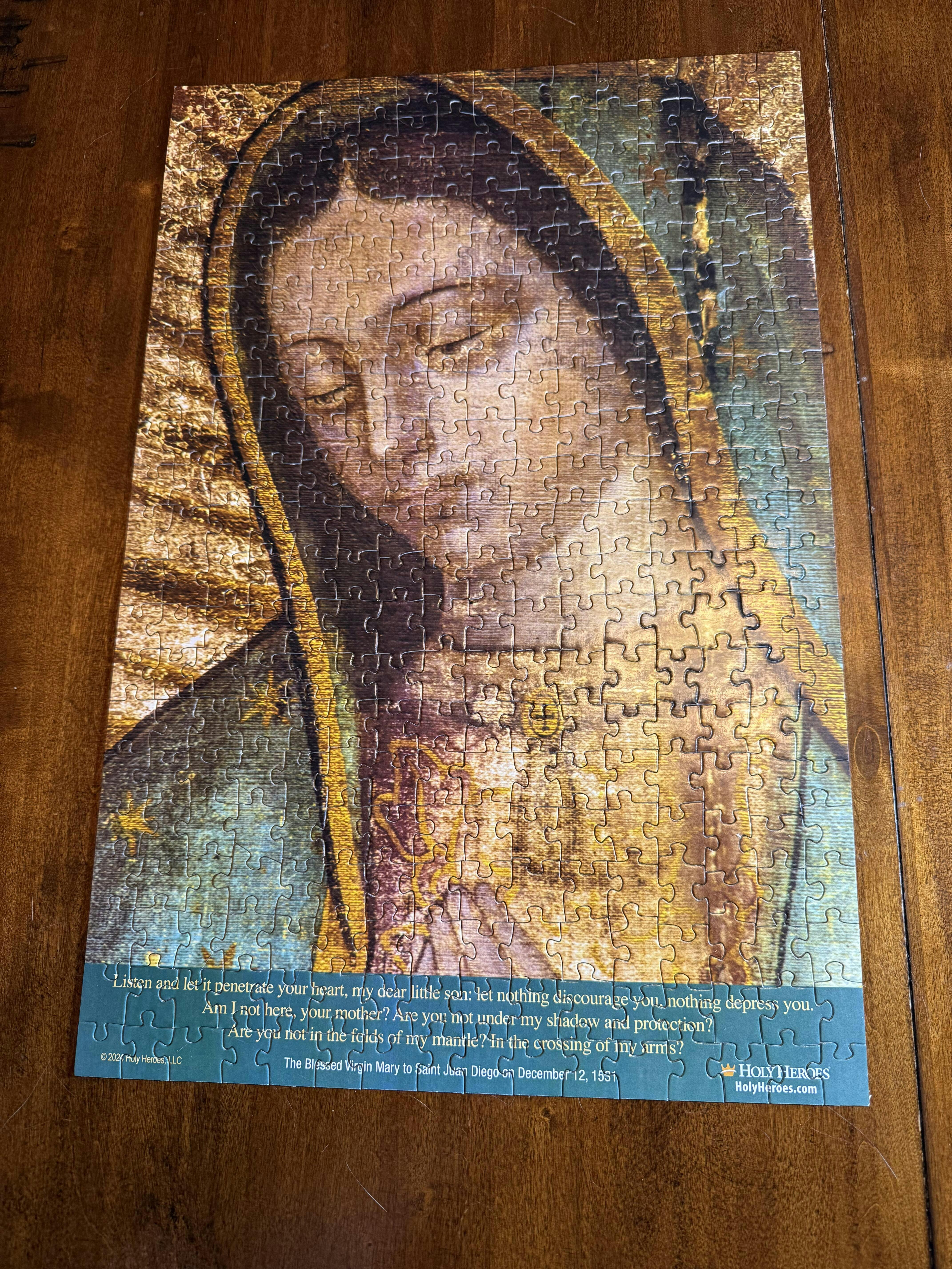 The bottom of the puzzle features this comforting quote from Our Blessed Mother to St. Juan Diego on Dec 12, 1531. She is speaking to all of us today, as well. It reads: